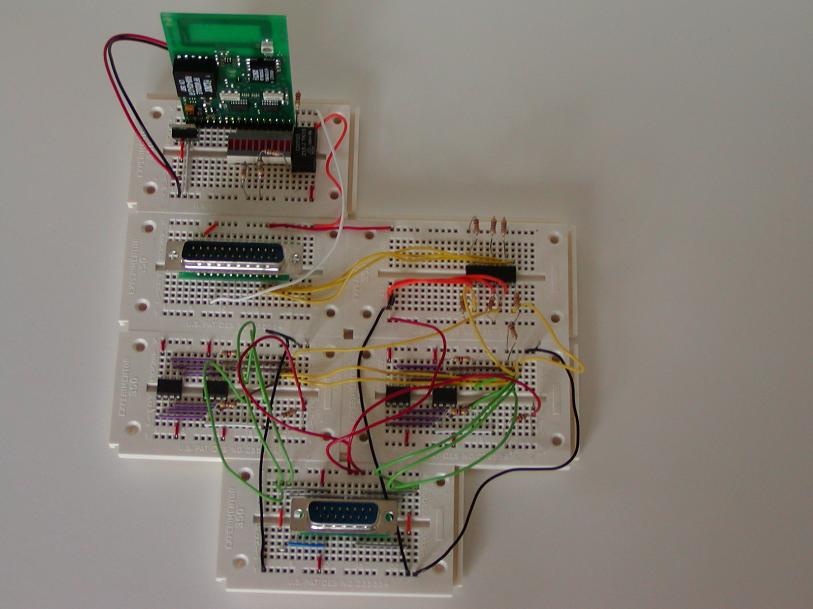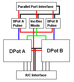 The device connects to a PC by plugging into the parallel port. It connects to the remote control unit by a breadboard I put together. [photo] All the programming is done in C++. I built a class that models the potentiometers in the car's remote.